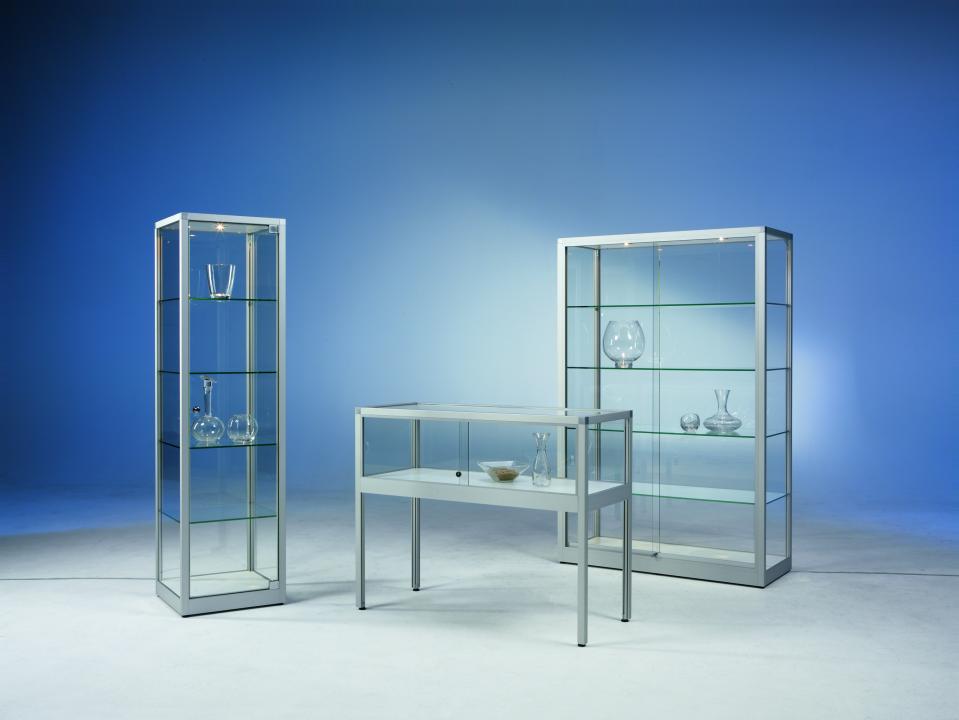Glasvitrine Vertum - die variable Standvitrine - optional mit Brandschutz Profil-Ansicht von 32 mm - inkl. vier stufenlos verstellbare Glasböden für schwere Exponate – Belastung bis 20kg pro Boden - Optional RAL-Farbe nach WunschGrößen B/H/T1020 × 2000 × 520 mm1220 × 2000 × 520 mm1520 × 2000 × 520 mm2020 × 2000 × 520 mm – mit Glasbodenteilung Öffnung - Rollengelagerte GlasschiebetürenVerglasung - Einscheiben-Sicherheitsglas / ESGOberfläche - Eloxierung in matt-silber (E6/EV1) optional RAL-Farbe nach WunschBeleuchtung - ohne Beleuchtung optional mit LED-Strahlern, in Deckenbereich integriertSchließung - Sicherheitsschloss mit 2 SchlüsselnBrandschutz - optional mit Metallblechfüllungen statt Schichtstoffplatten im Deckel und BodenSie benötigen ein Sondermaß? Kein Problem! Wir fertigen Ihre Vitrine in Sonderanfertigung! Sprechen Sie uns an.