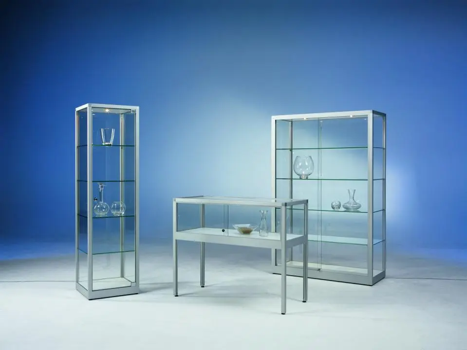 Öffnung - Glasschiebetüren an der FrontseiteVerglasung - Einscheiben-Sicherheitsglas / ESGOberfläche - Eloxierung in matt-silber (E6/EV1)optional: RAL-Farbton nach WunschBeleuchtung - ohne Beleuchtung - optional: waagerechte Strahlerschiene mit LED-Strahlern, inkl. TrafoSchließung - Sicherheitsschloss mit 2 Schlüsseln